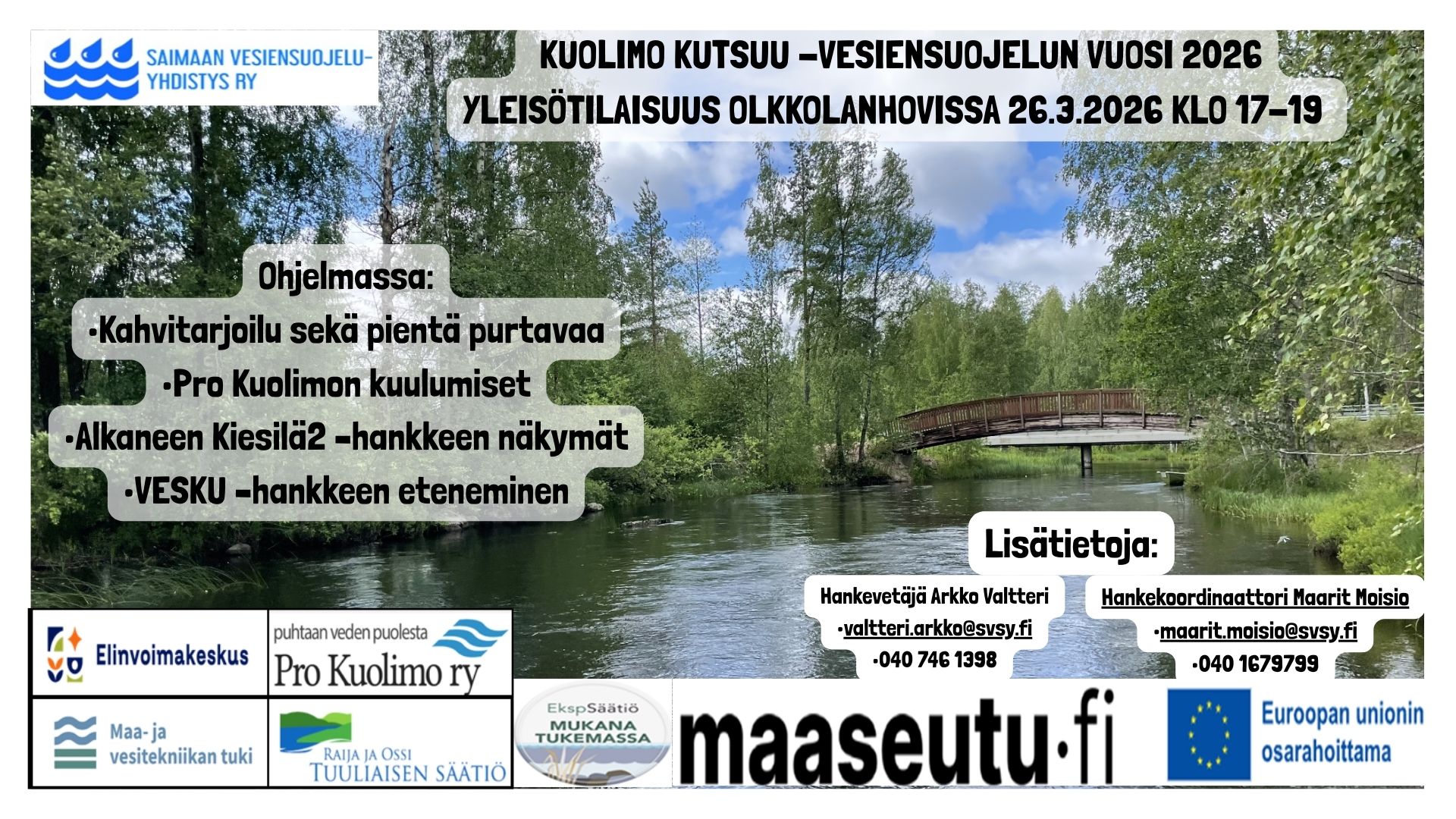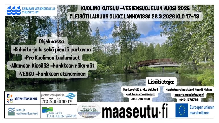 Kuolimon vesiensuojelussa otetaan isoja askelia vuoden 2026 aikana. Saimaan vesiensuojeluyhdistyksen hallinnoimissa Vesku- ja Kiesilänjoki-hankkeissa ryhdytään vesiensuojeluratkaisujen suunnittelun lisäksi käytännön toteutuksiin Kuolimoon kohdistuvan ulkoisen kuormituksen vähentämiseksi. Tule mukaan keskustelemaan ja kuulemaan, mitä Kuolimolla on parhaillaan meneillään ja kertomaan myös omat havaintosi. Paikan päällä on kahvitarjoilu ja pientä purtavaa.